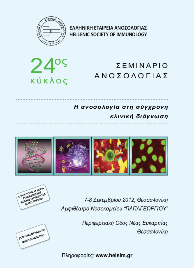 Το 24ο Μετεκπαιδευτικό Σεμινάριο της Ε.Ε.Α. “Η ΑΝΟΣΟΛΟΓΙΑ ΣΤΗ ΣΥΓΧΡΟΝΗ ΚΛΙΝΙΚΗ ΔΙΑΓΝΩΣΗ” πραγματοποιήθηκε με επιτυχία στο Αμφιθέατρο του Νοσοκομείου “Παπαγεωργίου” στη Θεσσαλονίκη 7 και 8 Δεκεμβρίου 2012.