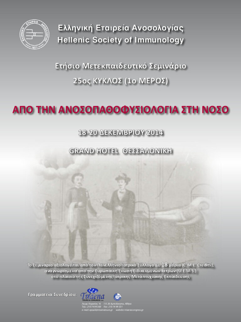 Το Διοικητικό Συμβούλιο της Ελληνικής Εταιρείας Ανοσολογίας οργανώνει, τον 25ο Κύκλο του Ετήσιου Μετεκπαιδευτικού Σεμιναρίου Ανοσολογίας, με θέμα «Από την Ανοσοπαθοφυσιολογία στη νόσο”, το οποίο θα πραγματοποιηθεί 18-20 Δεκεμβρίου 2014, στο Grand Hotel Palace, στη Θεσσαλονίκη. Στη διάρκεια των 3 ημερών της εκδήλωσης, οι συμμετέχοντες θα παρακολουθήσουν μια σειρά εισηγήσεων για τη Βασική Ανοσολογία: Αρχές Ανοσιακής απάντησης, Μηχανισμοί άμυνας και φλεγμονής, Ανοσοπαθοφυσιολογία νοσημάτων, Διαγνωστικοί ανοσολογικοί δείκτες, Ανοσοθεραπεία (δείτε το πρόγραμμα). Το δικαίωμα συμμετοχής στο Σεμινάριο είναι: